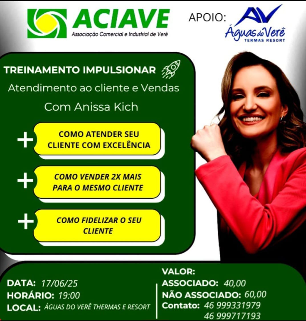 A Associação Comercial e Industrial de Verê (ACIAVE) realizará no dia 17 de junho de 2025, às 19h, um evento voltado para o aperfeiçoamento profissional na área de atendimento ao cliente e vendas. Com o apoio do Águas do Verê Thermas e Resort, o Treinamento Impulsionar será ministrado por Anissa Kich, especialista reconhecida no tema.