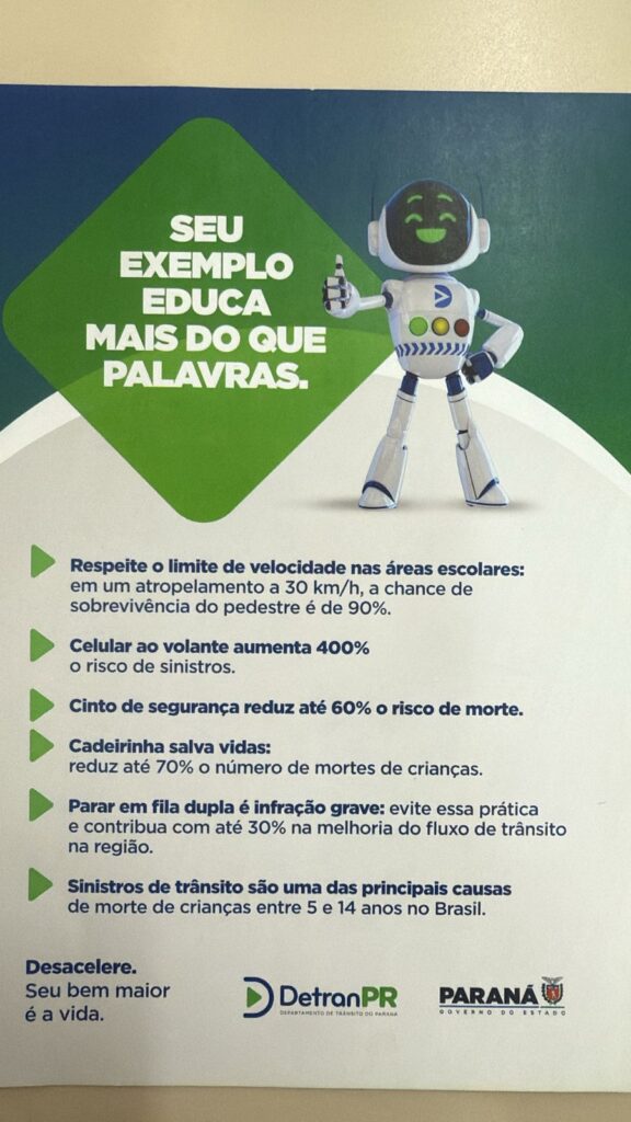 A ação teve como foco principal a conscientização de motoristas, pais e estudantes sobre a importância de adotar comportamentos seguros no trânsito. Durante a atividade, foram distribuídos materiais educativos com orientações sobre prevenção de acidentes e respeito às normas de circulação.
