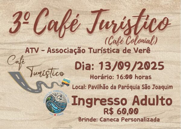 ByRedação27 de agosto de 2025A Associação Turística de Verê realiza no próximo dia 13 de setembro de 2025, a partir das 16h, o 3º Café Turístico (Café...