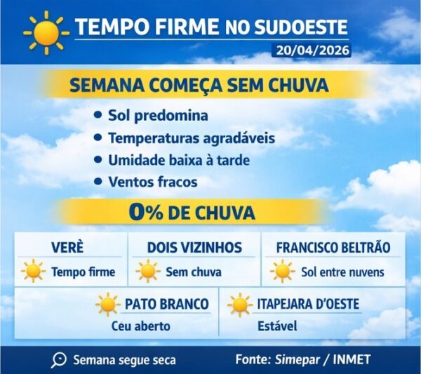 TEMPO FIRME E SEM CHUVA: SEMANA COMEÇA ESTÁVEL NO SUDOESTE DO PARANÁ (20)