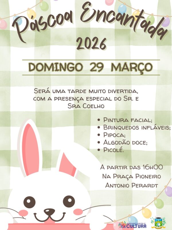 ByRedação16 de março de 2026A Prefeitura Municipal, por meio do Departamento Municipal de Cultura, convida toda a comunidade para participar da Páscoa Encantada 2026. O evento será...