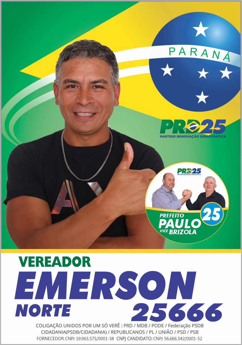 Então me vejo preparado e convicto que posso trazer o melhor para verê, respeitando a cada cidadão vereense, e fiscalizando o dinheiro público eu me coloco a disposição de todos, para vereador pelo PRD, partido da renovação democrática 25666 e se por um motivo ou outro não quiser me dar um apoio eu peço do fundo do meu coração, vote em candidatos novos e sabemos que tem muitos que são competentes e peço que escolha candidatos da chapa do prefeito Paulo com o PRD para podermos apoiar e assinar projetos que vão alavancar nossa querida verê então vamos lá para que o progresso venha vote 25666 e para que o progresso aconteça Emerson norte na cabeça , obrigado e até breve .