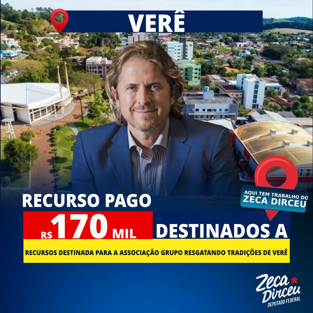 O deputado federal Zeca Dirceu assegurou a destinação de um recurso no valor de R$ 170 mil para o município de Verê, no sudoeste do Paraná. O montante, proveniente de emenda individual do parlamentar, será investido em melhorias para a Associação Grupo Resgatando Tradições de Verê, entidade que desempenha papel importante na preservação da cultura gaúcha na região.