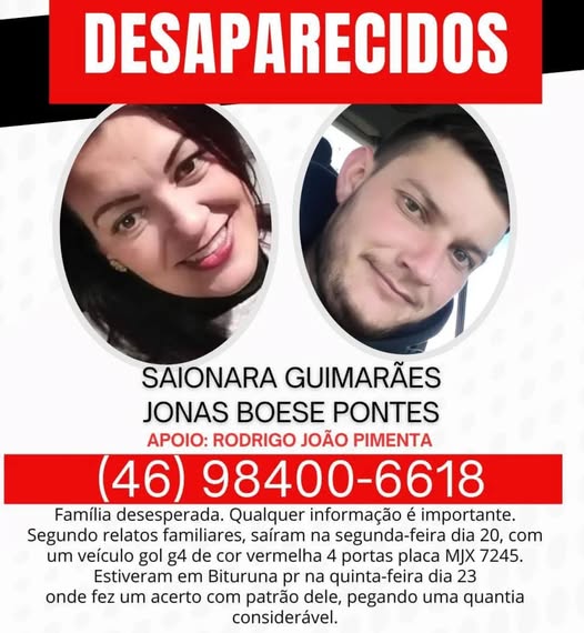 HÁ 13 dias que não fazem contato. Segundo relatos familiares, saíram na segunda-feira dia 20, com um veículo gol g4 de cor vermelha 4 portas placa MJX 7245. Estiveram em Bituruna pr na quinta-feira dia 23, onde fez um acerto com patrão dele, pegando uma quantia considerável. Chamar: 46 98400 6618 Elaine Boese.