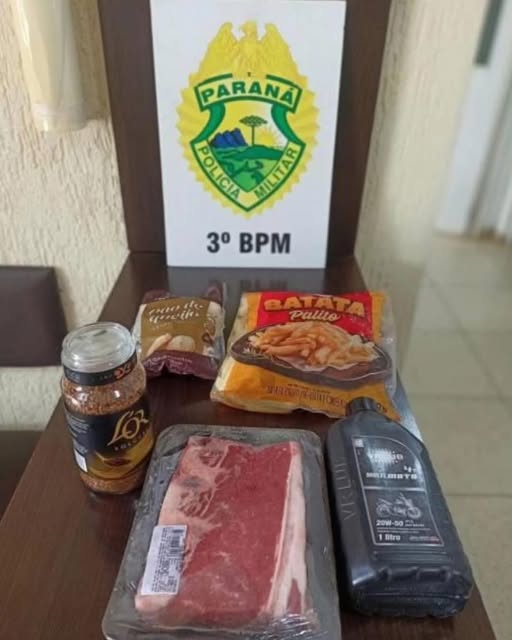 Entre os itens recuperados estavam um vidro de café, um pacote de batata frita, um pacote de pão de queijo, uma bandeja de carne tipo bife e, curiosamente, um litro de óleo lubrificante.