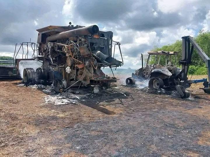 As maquinas são, uma colheitadeira John Deere 9470 ano 2010 e um trator Case Formal 80, quando os bombeiros chegaram ao local ambas as maquinas já estavam totalmente queimadas as máquinas não tinham seguro. As causas do sinistro são desconhecidos se pode ter sido um problema elétrico, mecânico ou criminal.