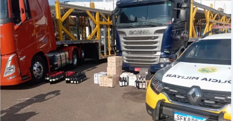 Polícia Militar apreende caminhões com mais de 600 garrafas de vinho argentino em Barracão.