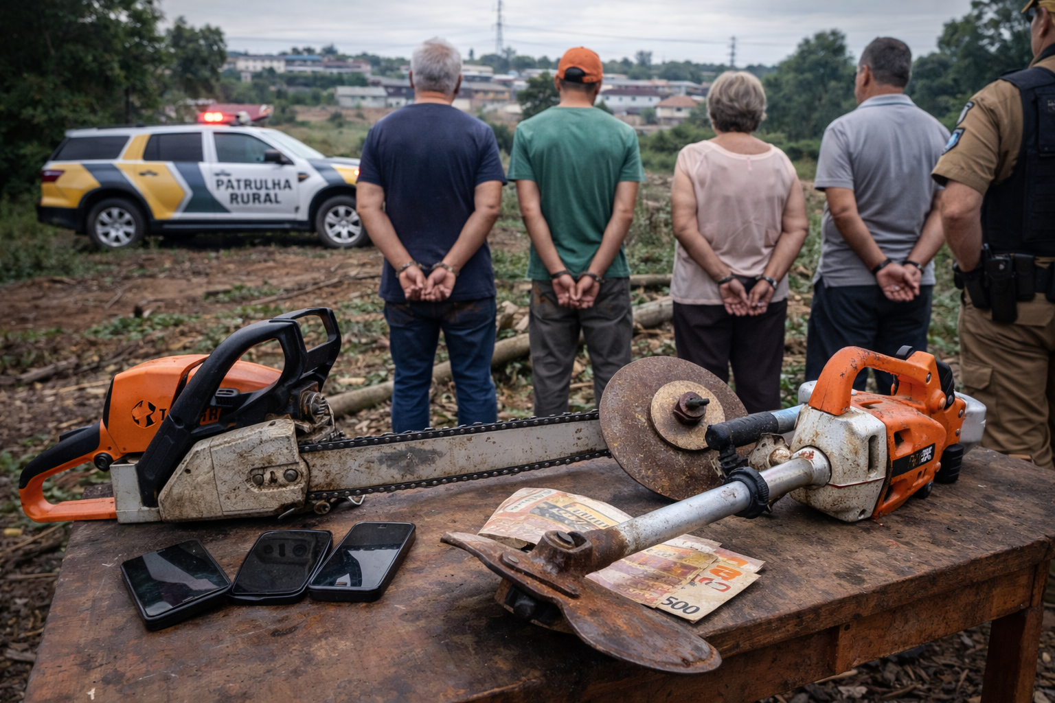 Quatro pessoas foram detidas na manhã desta quarta-feira (12), por volta das 9h, durante atendimento a uma ocorrência de crime ambiental no Bairro Industrial, em Realeza.