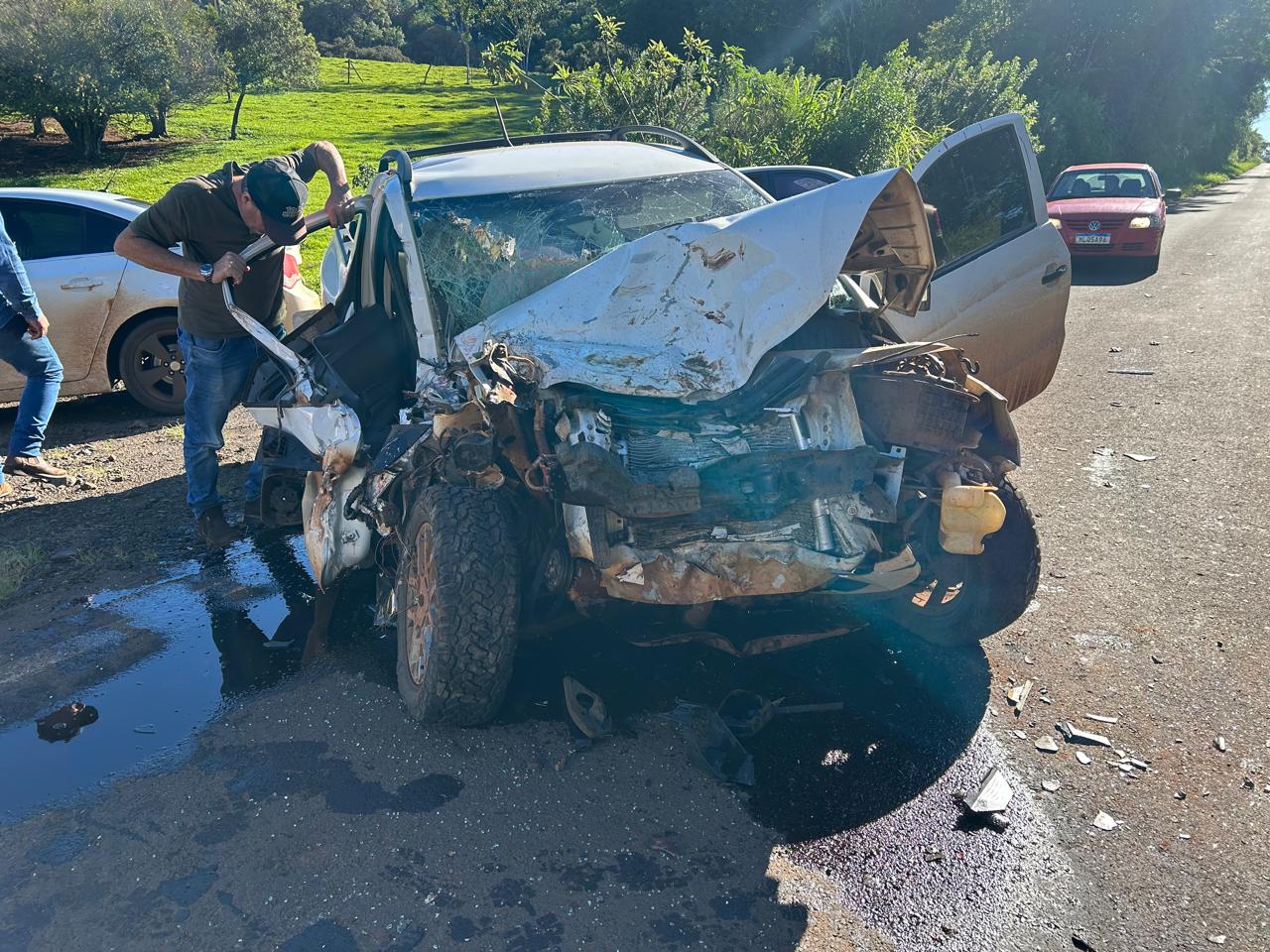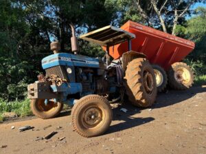 Duas pessoas ficaram feridas em um grave acidente de trânsito na tarde desta quarta-feira (17), na rodovia PR-562, no trecho que liga Coronel Vivida a Honorio Serpa. De acordo com informações, a Saveiro e o trator seguiam no mesmo sentido, e no momento que a máquina agrícola tentou acessar uma estrada rural à esquerda aconteceu a colisão. O condutor da Saveiro teve ferimentos moderados e foi encaminhado ao hospital pelo Corpo de Bombeiros. O motorista do trator relatou dores na cabeça e no pescoço e foi encaminhado à Unidade de Pronto Atendimento para avaliação médica. Colaboração: Adelino Guimarães/Voz FM