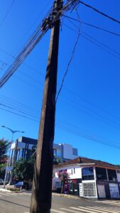 Conforme informações, um caminhão carregando uma ceifa, enroscou nos fios e arrebentou, na sequencia, o motorista do caminhão ao perceber o ocorrido, parou mais a frente; desceu do caminhão, puxou os cabos junto ao poste e seguiu caminho.