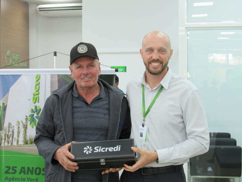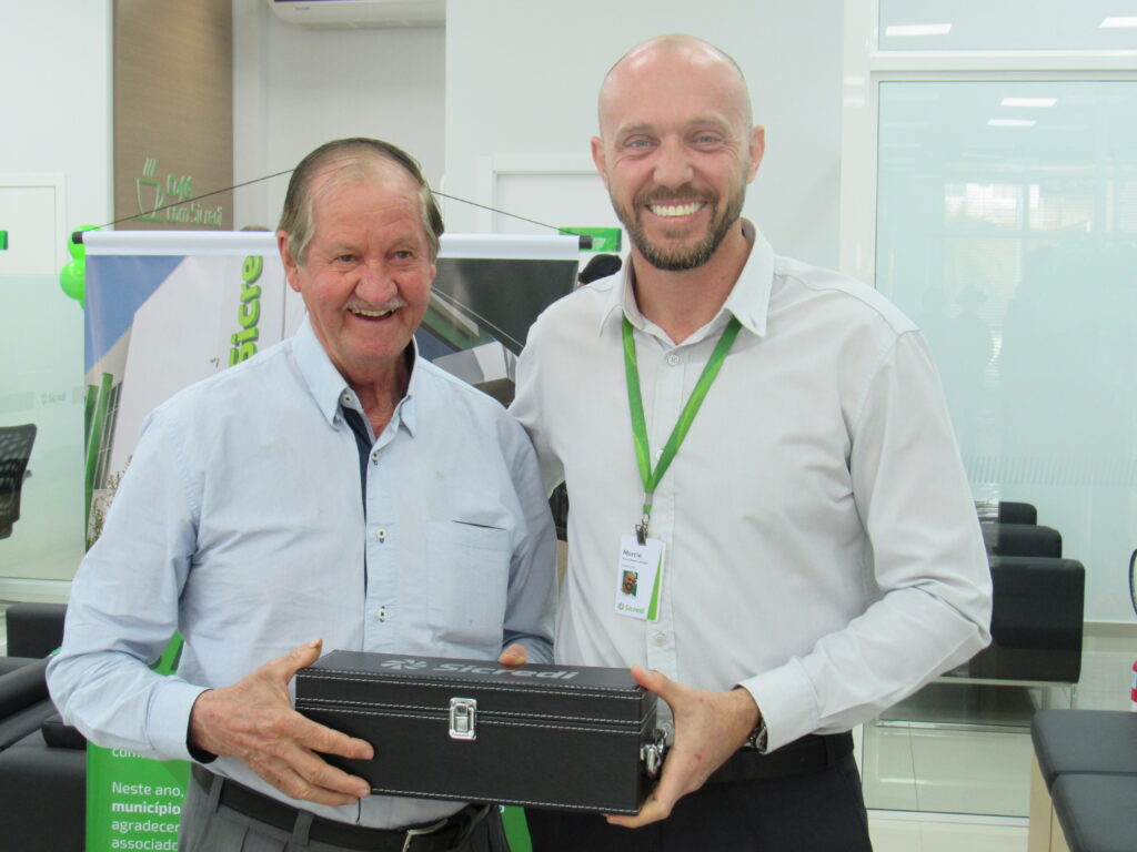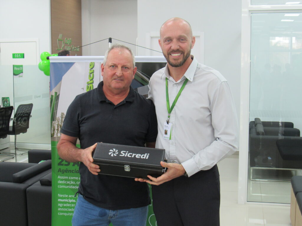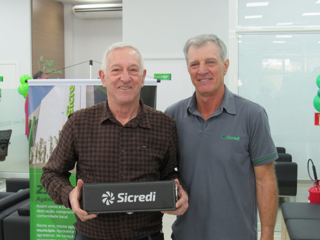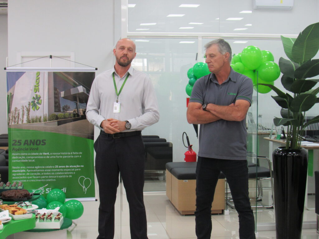 Durante este quarto de século, a agência se firmou como pilar econômico e cooperativo. Em evento significativo, o gerente Márcio Roberto Machado e o conselheiro Deyves Zolet agradecem aos presentes. Reconheceram os primeiros 25 cooperados com uma lembrança simbólica, um gesto simples, eficiente e cheio de significado.