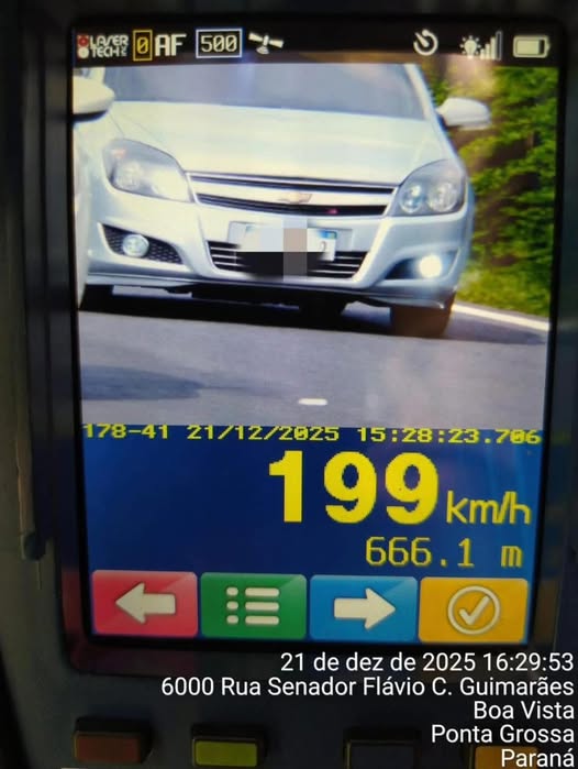 De acordo com as informações da PRE, o automóvel foi flagrado a 199 km/h, velocidade muito acima do permitido para o trecho, que varia entre 80 km/h e 110 km/h.