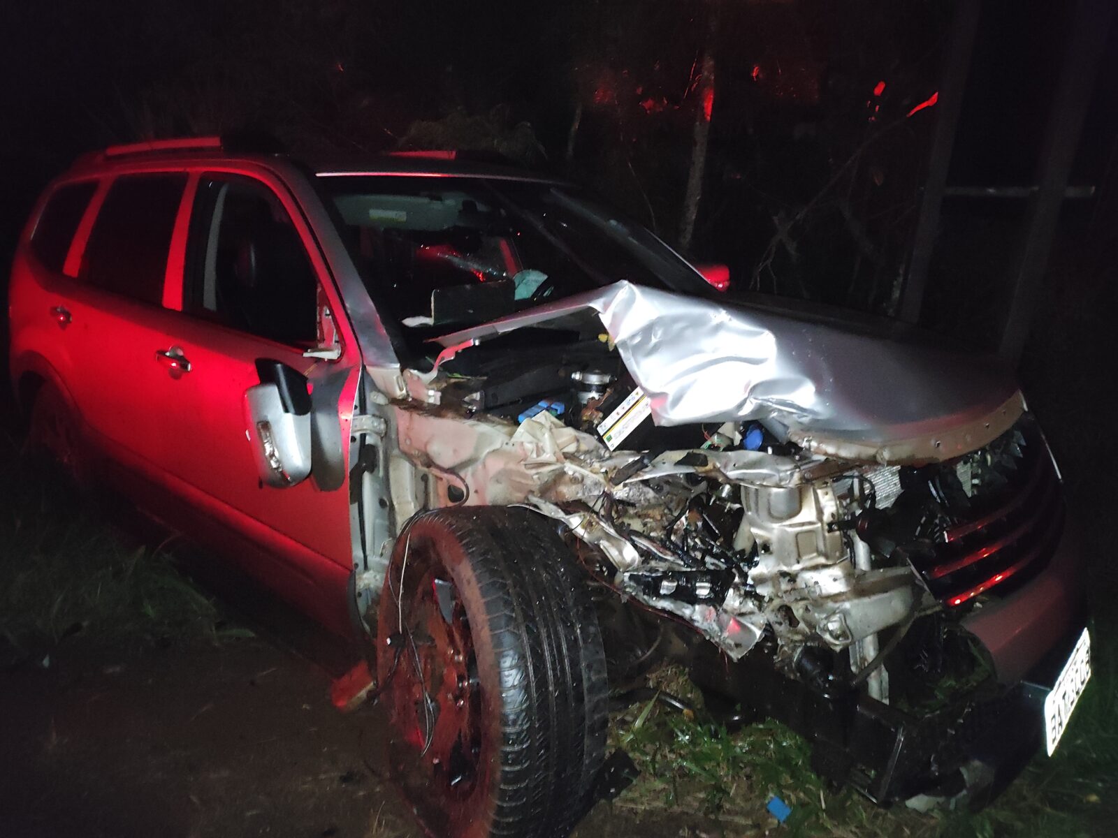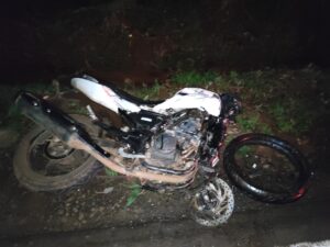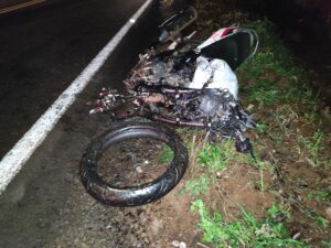 Com o impacto a motocicleta totalmente destruída, e a frente direita do veículo também. Ainda, com o impacto a moto foi lançada a quase 60m de distância de onde ficou o corpo do jovem em óbito.