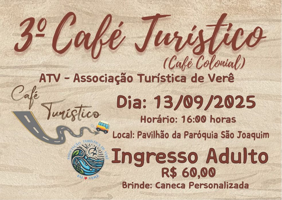 A Associação Turística de Verê realiza no próximo dia 13 de setembro de 2025, a partir das 16h, o 3º Café Turístico (Café Colonial). O evento acontecerá no salão paroquial da Igreja Matriz, reunindo tradição, cultura e gastronomia em um ambiente acolhedor.
