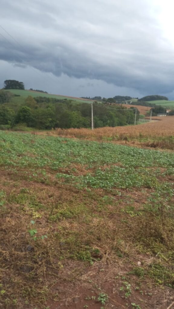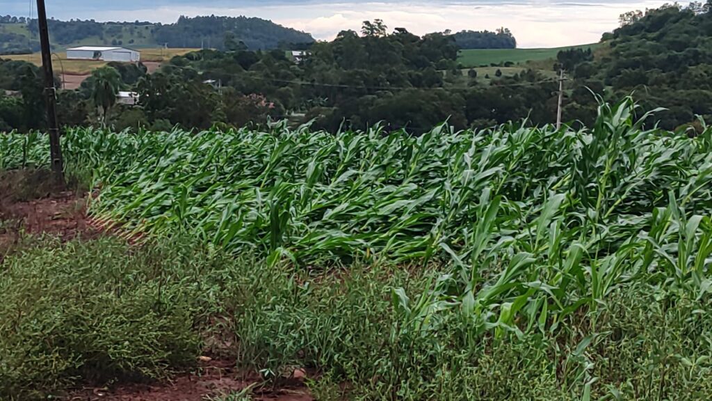 Ainda nas proximidades do bairro São Joaquim, lavoura de milho foi parcialmente danificada pela força do vento.