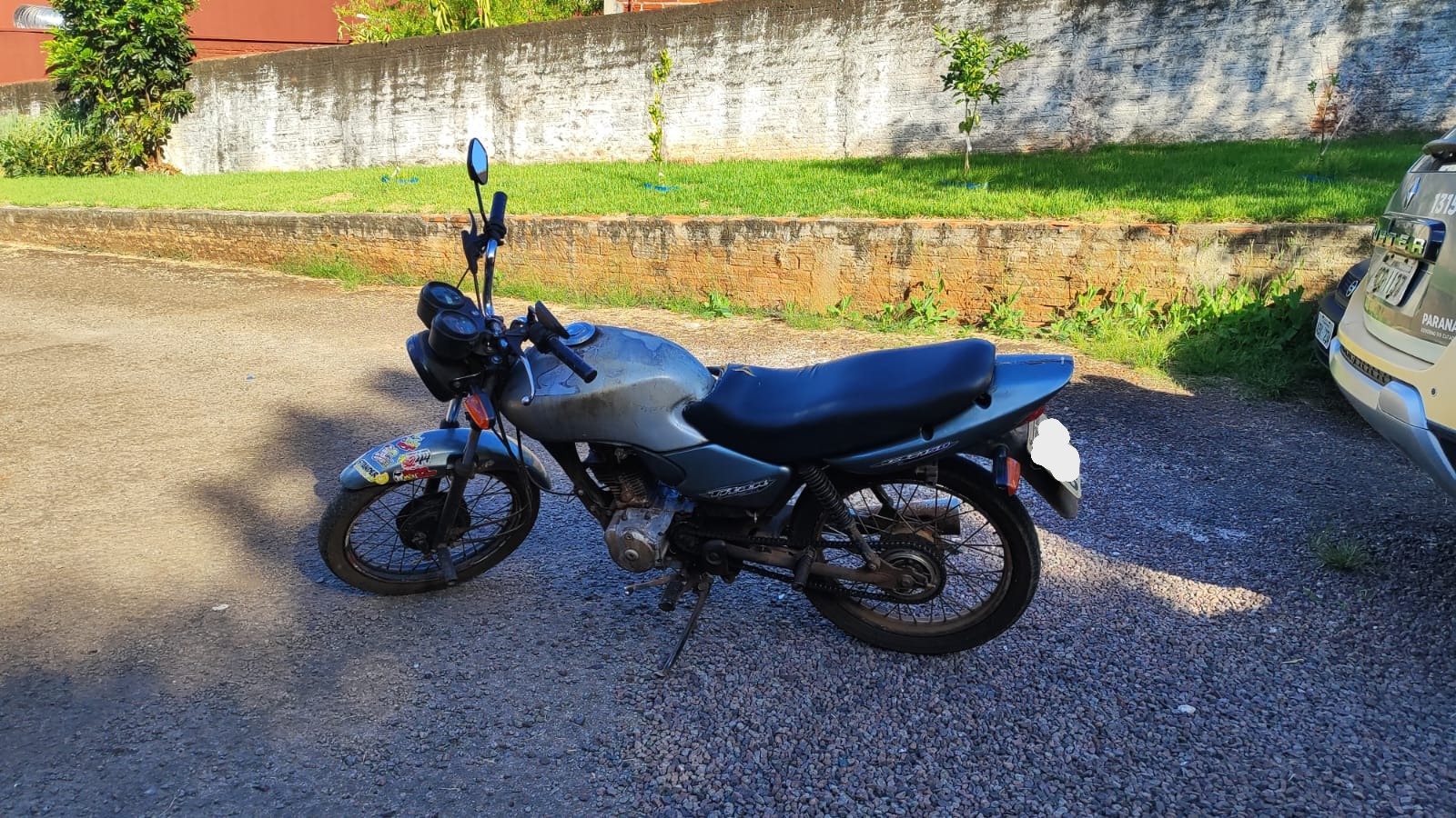 Durante a abordagem, constatou-se diversas situações, como pneu careca, débitos de impostos, e a situação que mais chamou a atenção foi a placa da moto. Através dos dados da placa, constatou se que a mesma, de modelo antigo, com tarjeta identificando registro em Coronel Vivida, porém, em consulta ao sistema, constatou-se que a placa refere-se à uma moto de outro modelo, emplacada no município de Santo Antonio do Sudoeste.