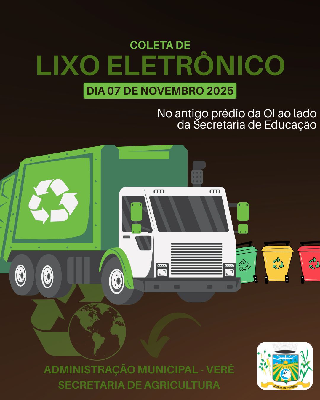 A Prefeitura de Verê, por meio da Secretaria Municipal de Agricultura, realiza no próximo dia 7 de novembro de 2025 uma ação voltada à destinação correta de resíduos tecnológicos: a Coleta de Lixo Eletrônico. O ponto de entrega será no antigo prédio da Oi, ao lado da Secretaria de Educação.