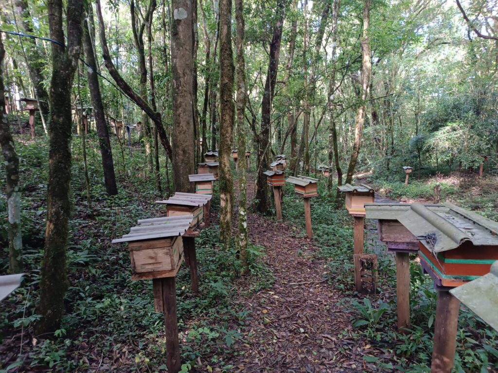 • Meliponário de Fábio Calegari, onde os estudantes conheceram de perto a produção de mel de abelhas sem ferrão, atividade cada vez mais valorizada como alternativa econômica.